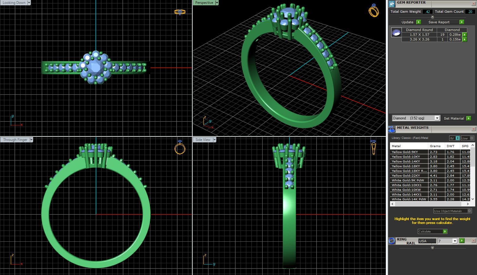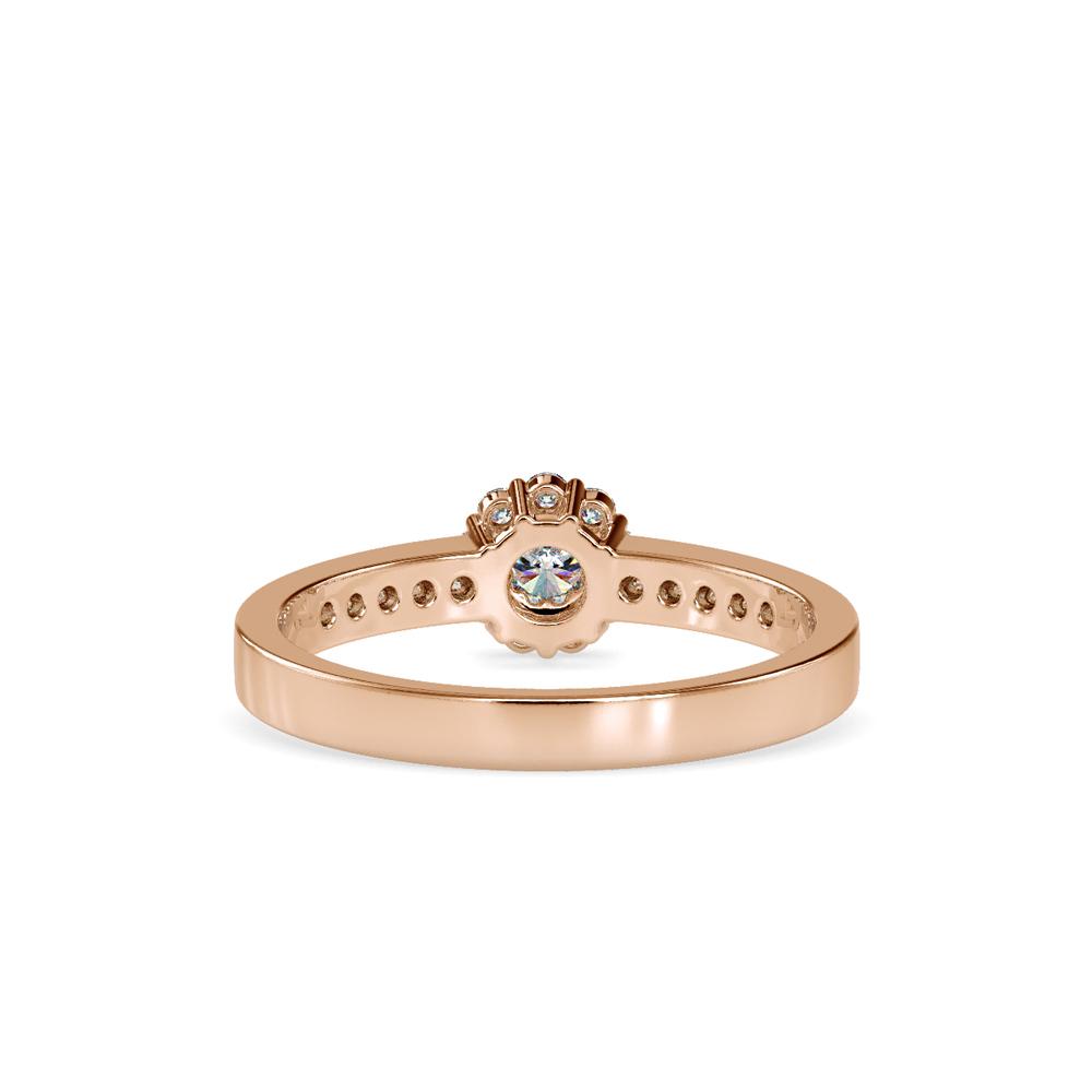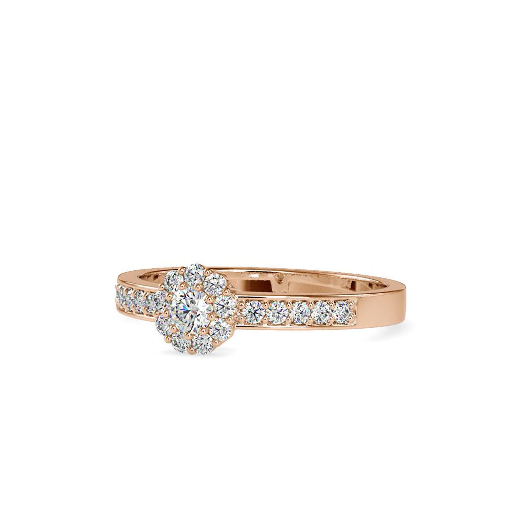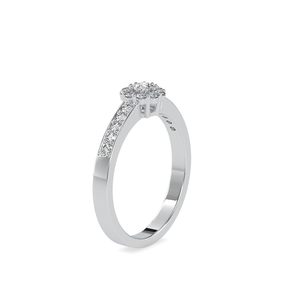 A round cluster of diamonds is accented with bead set shoulder diamonds.