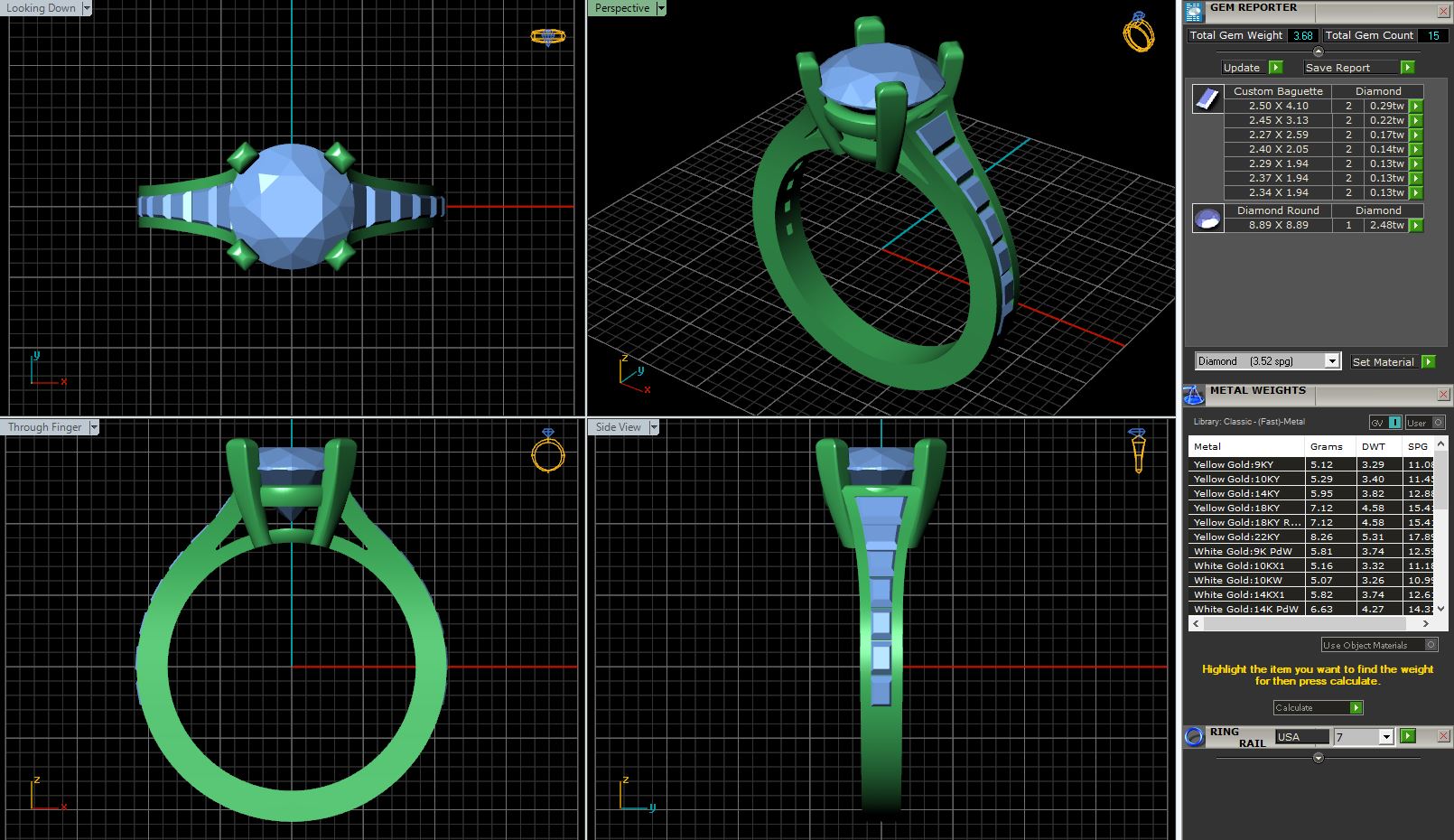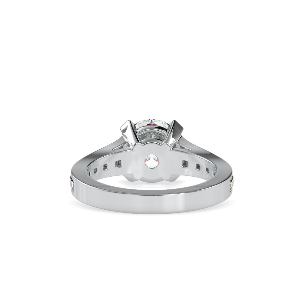 A round diamond ring secured in a four prong double gallery setting accented by fluted shoulders, which are channel set with graduating straight baguette cut diamonds